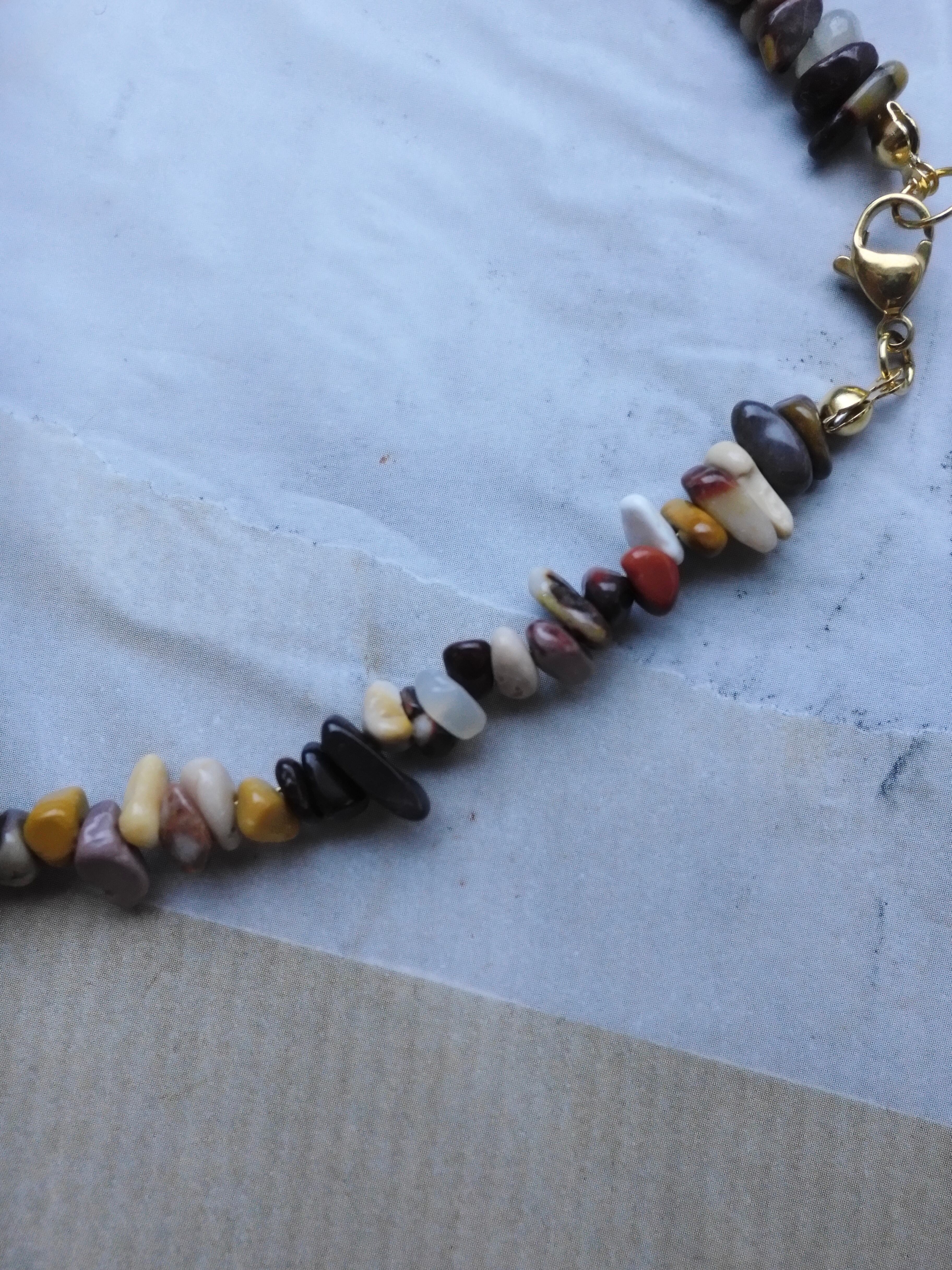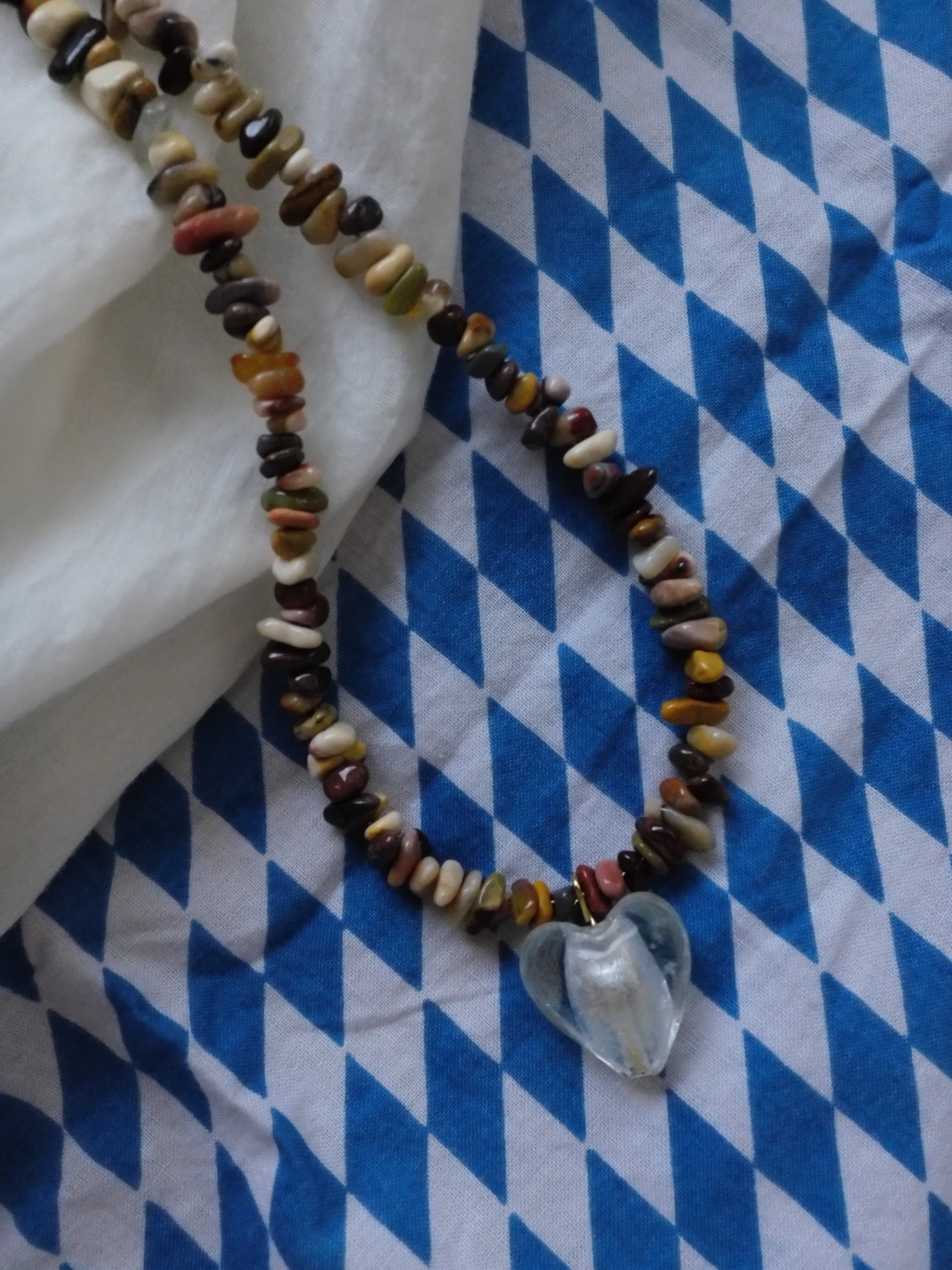 ジェリービーンズのような色とりどりの天然石モッカイトに、ガラスのハートを組み合わせたネックレス