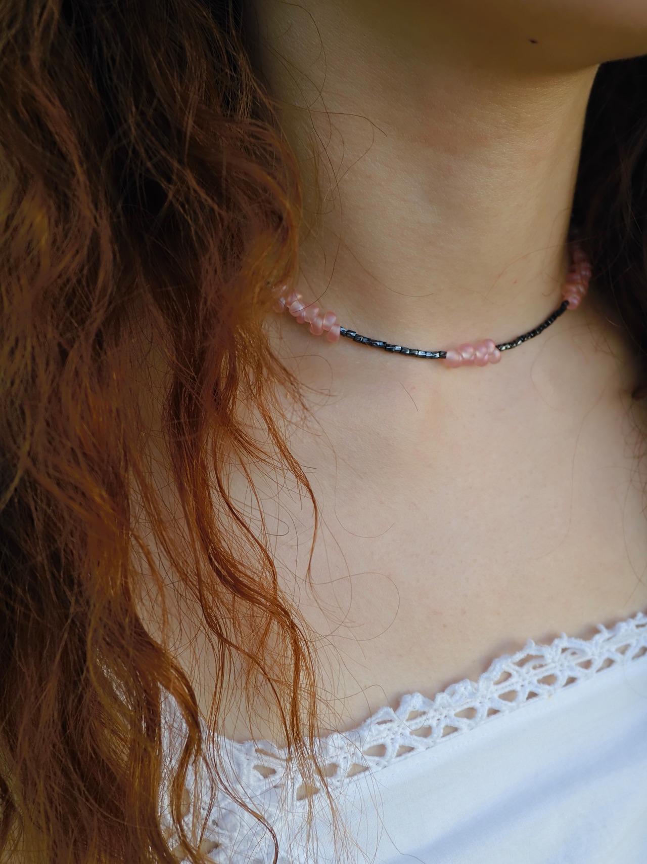 シアーでマットなピンクカラーのまが玉ビーズを組み合わせた、甘すぎず可愛いネックレス