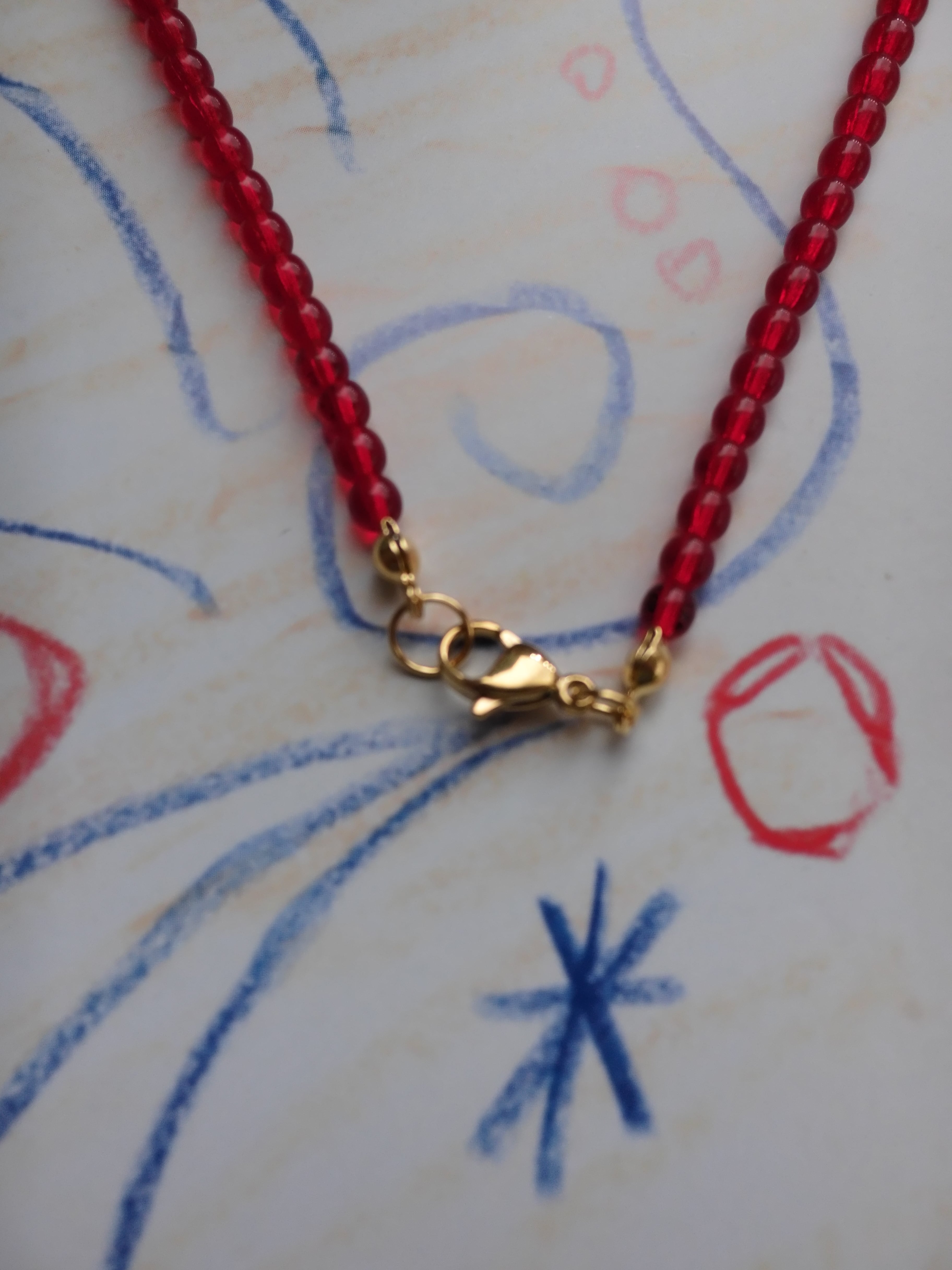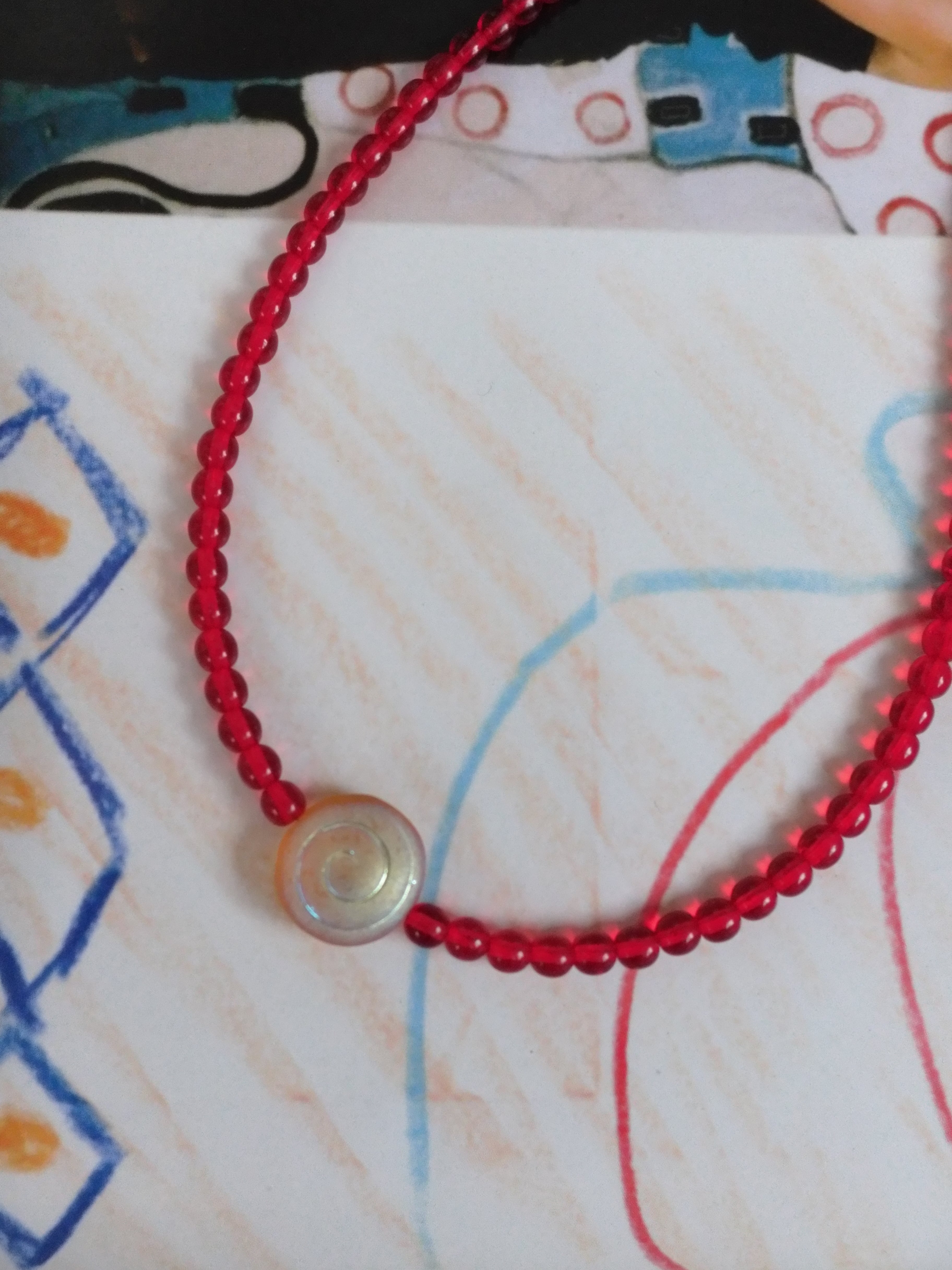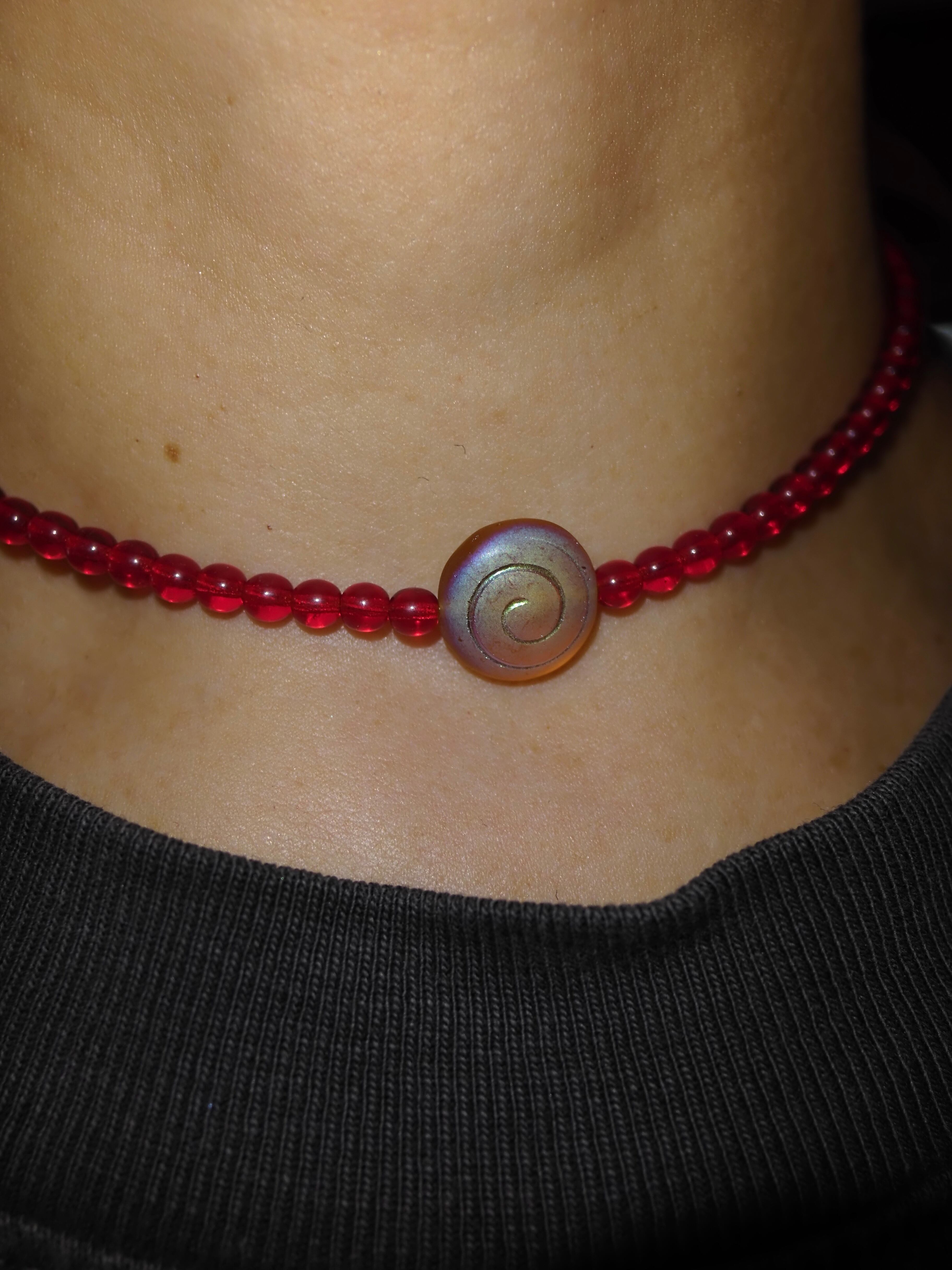 シナモンロール型のチェコビーズとレッドカラーのチェコビーズをあわせたチョーカータイプのネックレス