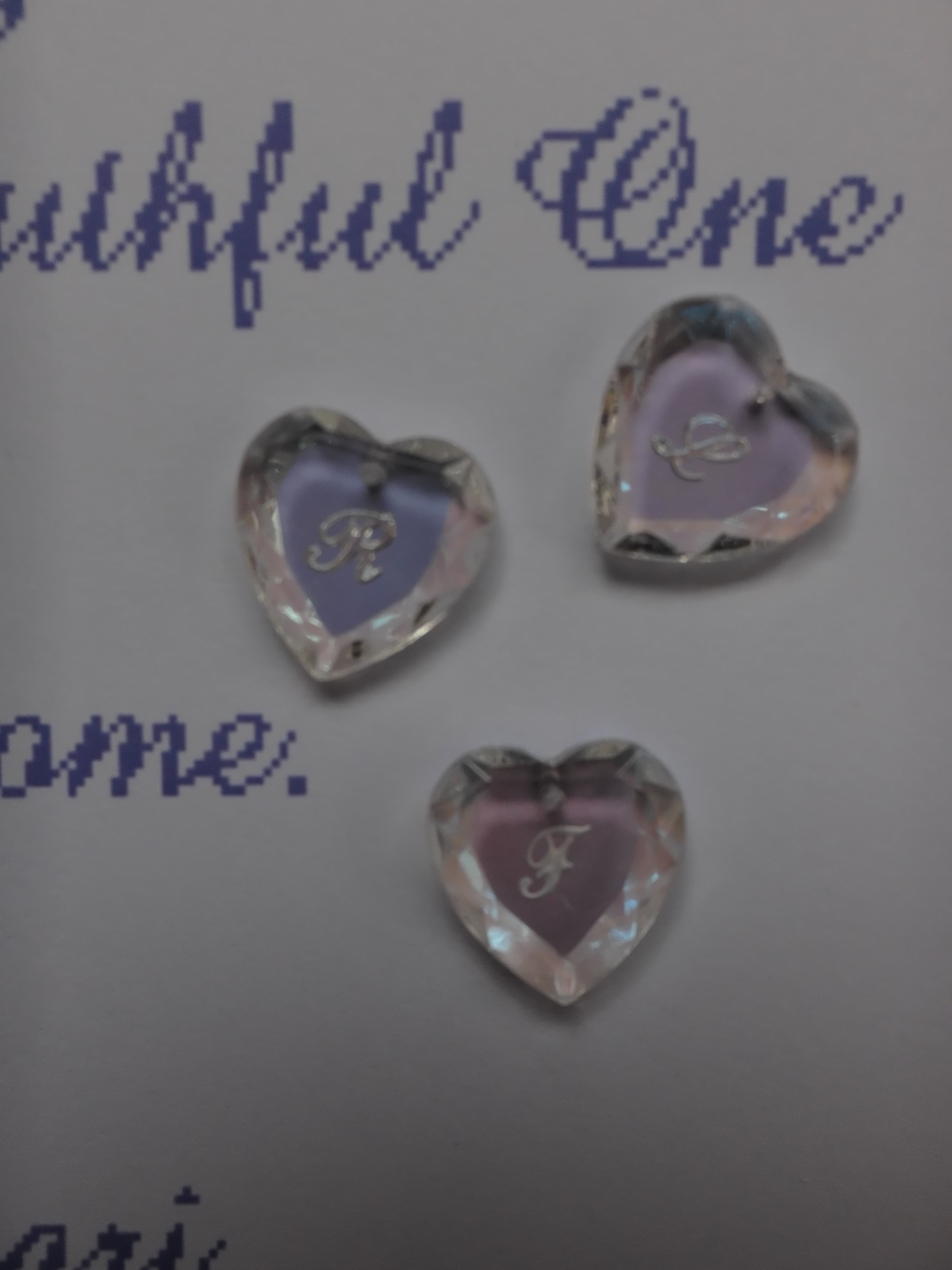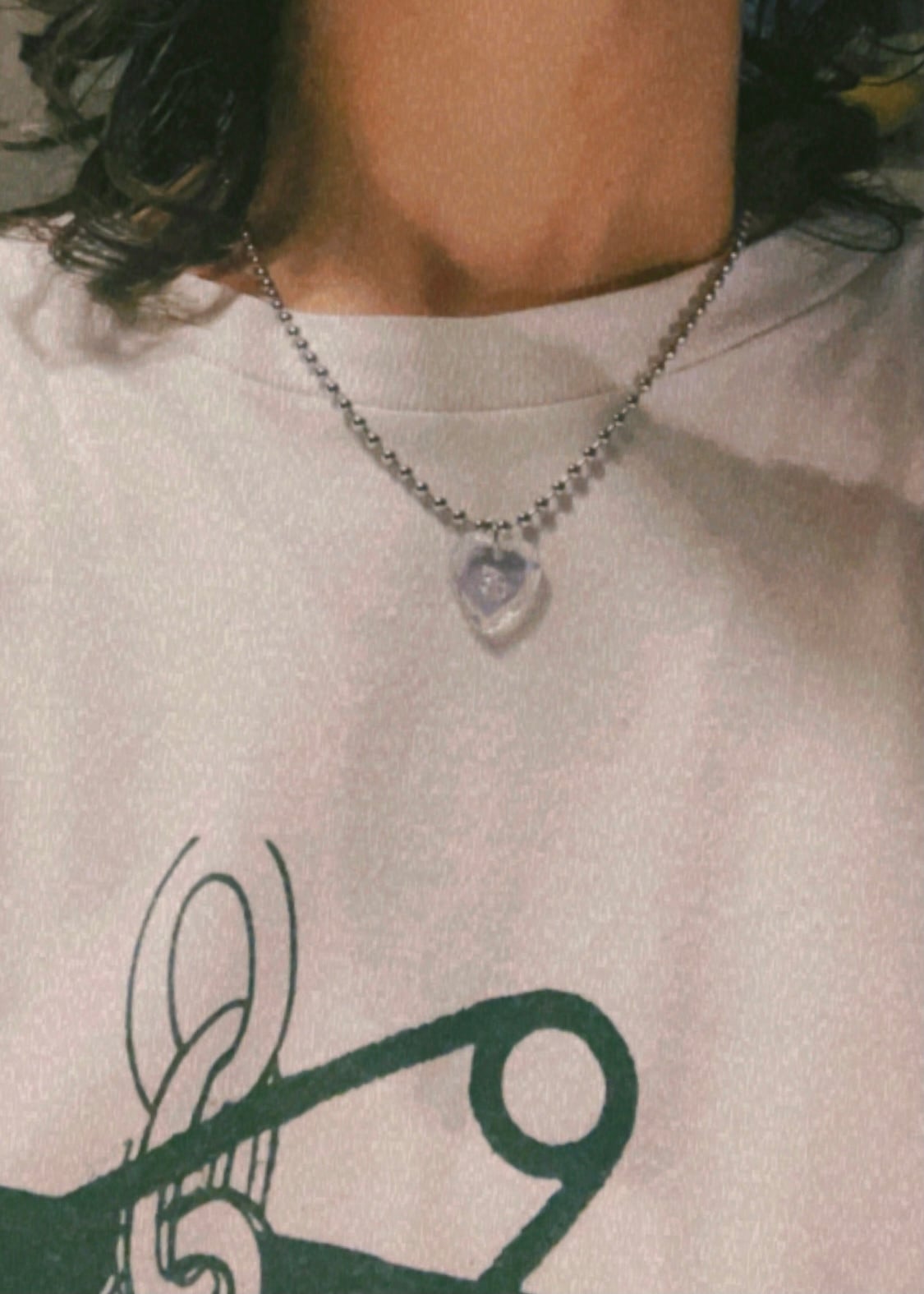 ハート型のグラスパーツは、一見クリアカラーですが、よく見ると背面に淡いオーロラカラーがかかっていて、角度や光の当たり方によって見え方が変わります