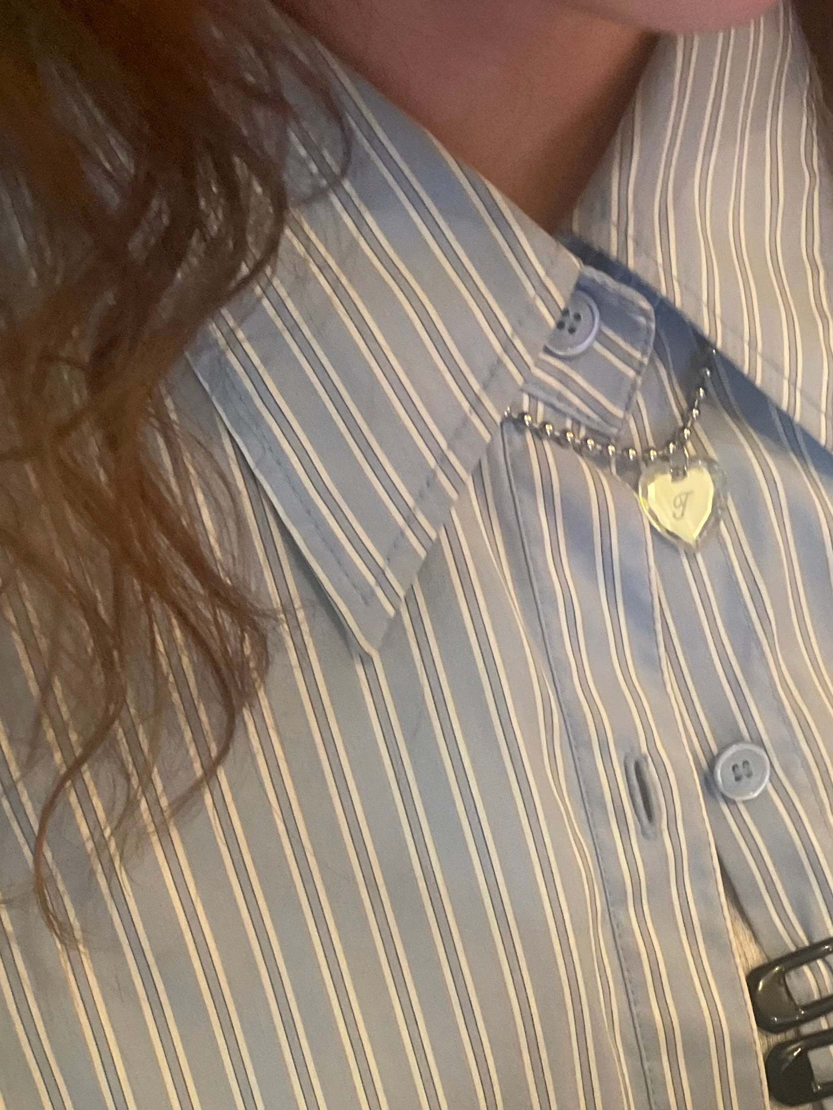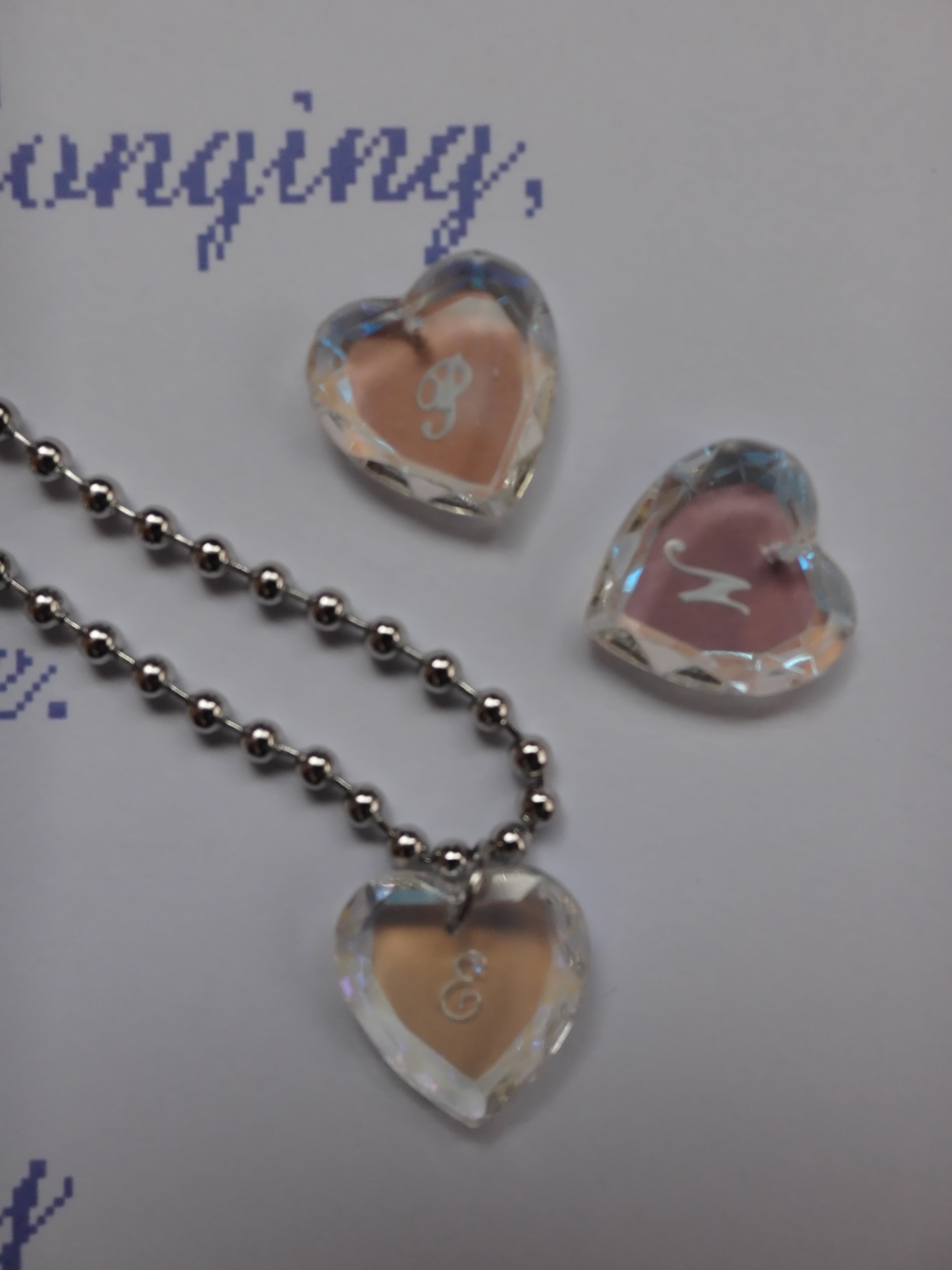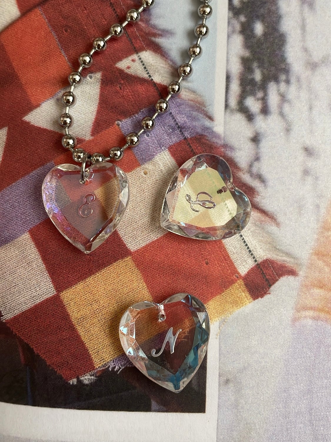 アルファベットが刻まれたハート型のドイツのグラスヴィンテージパーツに、ステンレス製のボールチェーンを組み合わせたペンダント